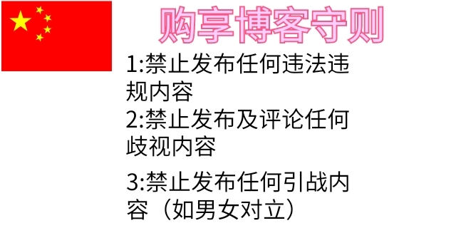 购享网络官方博客三大原则1:禁止发布任何违法违规内容。2:禁止发布及评论任何歧视内容。3:禁止发布任何引战内容。(如男女对立内容)如果发现违规内容请发送链接到我邮箱举报,我的邮箱:nianchen2024@163.com